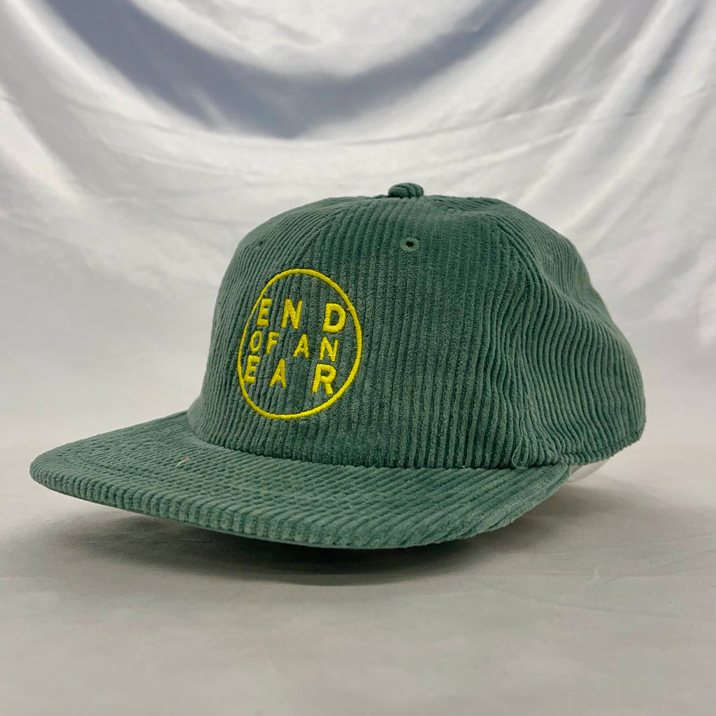 AS Colour Corduroy hat with yellow End of an Ear logo, embroidered on "Petrol Blue" and "Sage"